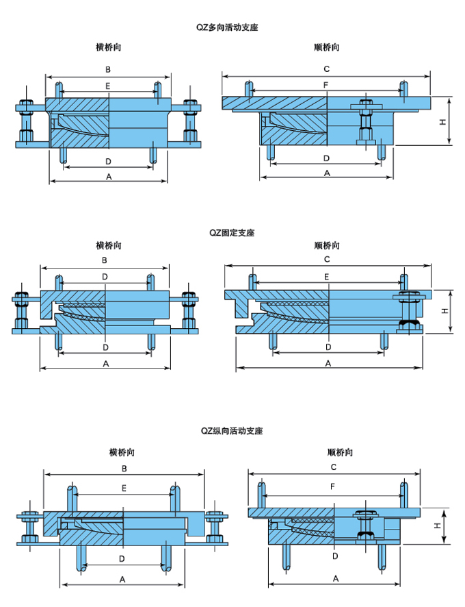 QZ系列球型支座是由上座板、下座板、凸形中間板及兩塊不同形狀的聚四氟乙烯板組成。下座板中間為 一凹形球面,同凸形中間板相對應(yīng),兩者之間襯有一弧形四氟板,通過球面與之滑動來滿足梁端的轉(zhuǎn)動;上座 板上的不銹鋼板與中間鋼板上的另一四氟板組成第二滑動面,完成梁體因溫差諸因素產(chǎn)生的伸縮位移。
