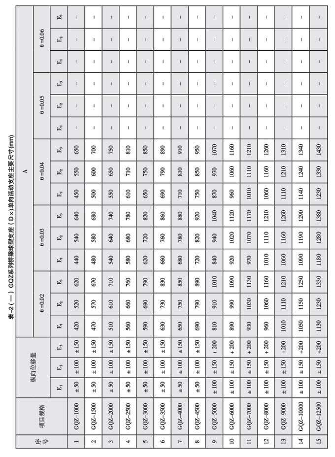 橫向位移:SX(雙向活動支座),1000~9000kN, e=±20mm, 10000~60000kN, e=±40mm DX(單向活動支座)e=±3mm,支座縱向、橫向位移量還可根據(jù)實際需要進行調(diào)整。
